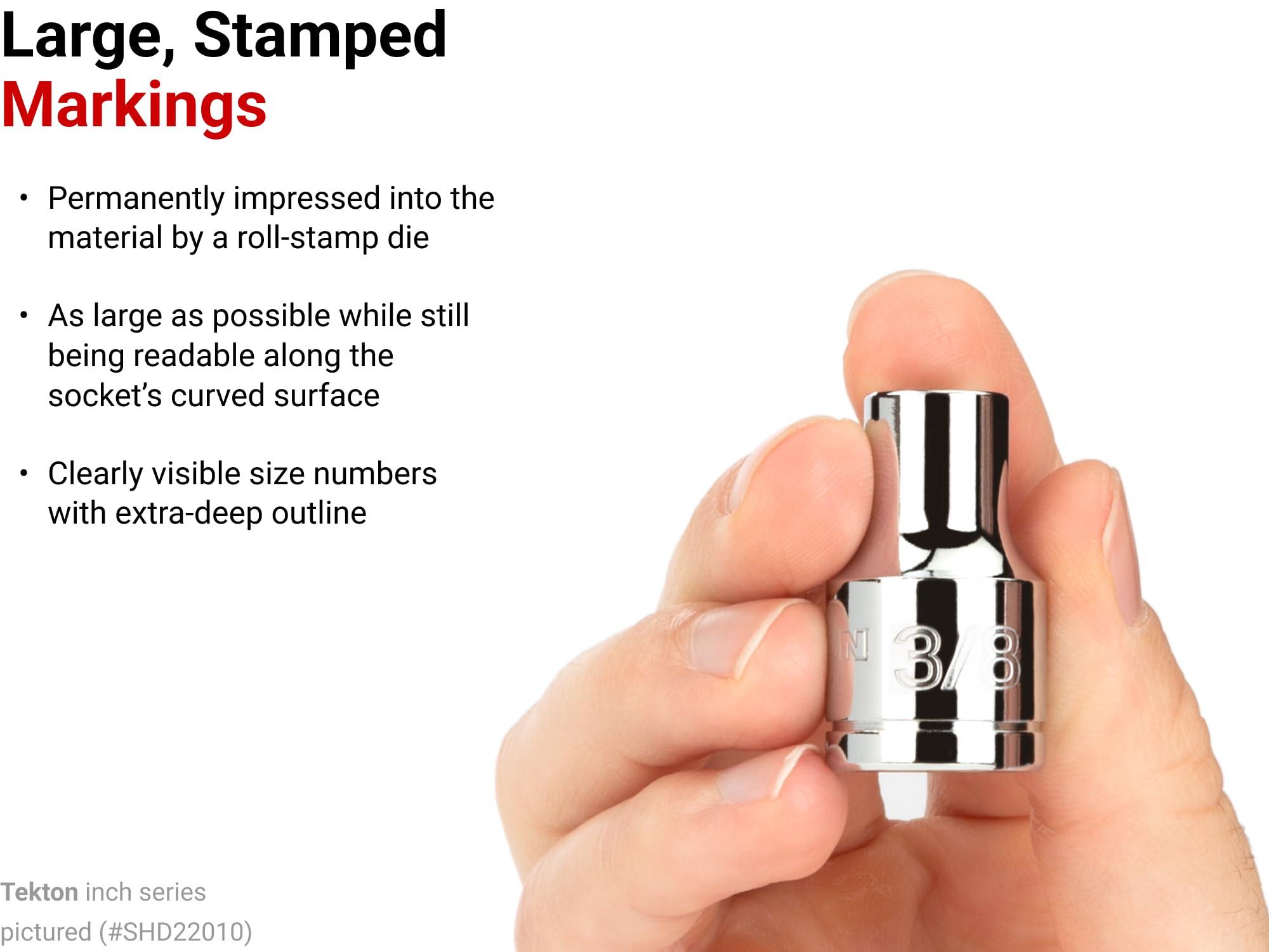 - Large, Stamped Markings – Permanently impressed into the material by a roll-stamp die and as large as possible while still being readable along the socket's curved surface