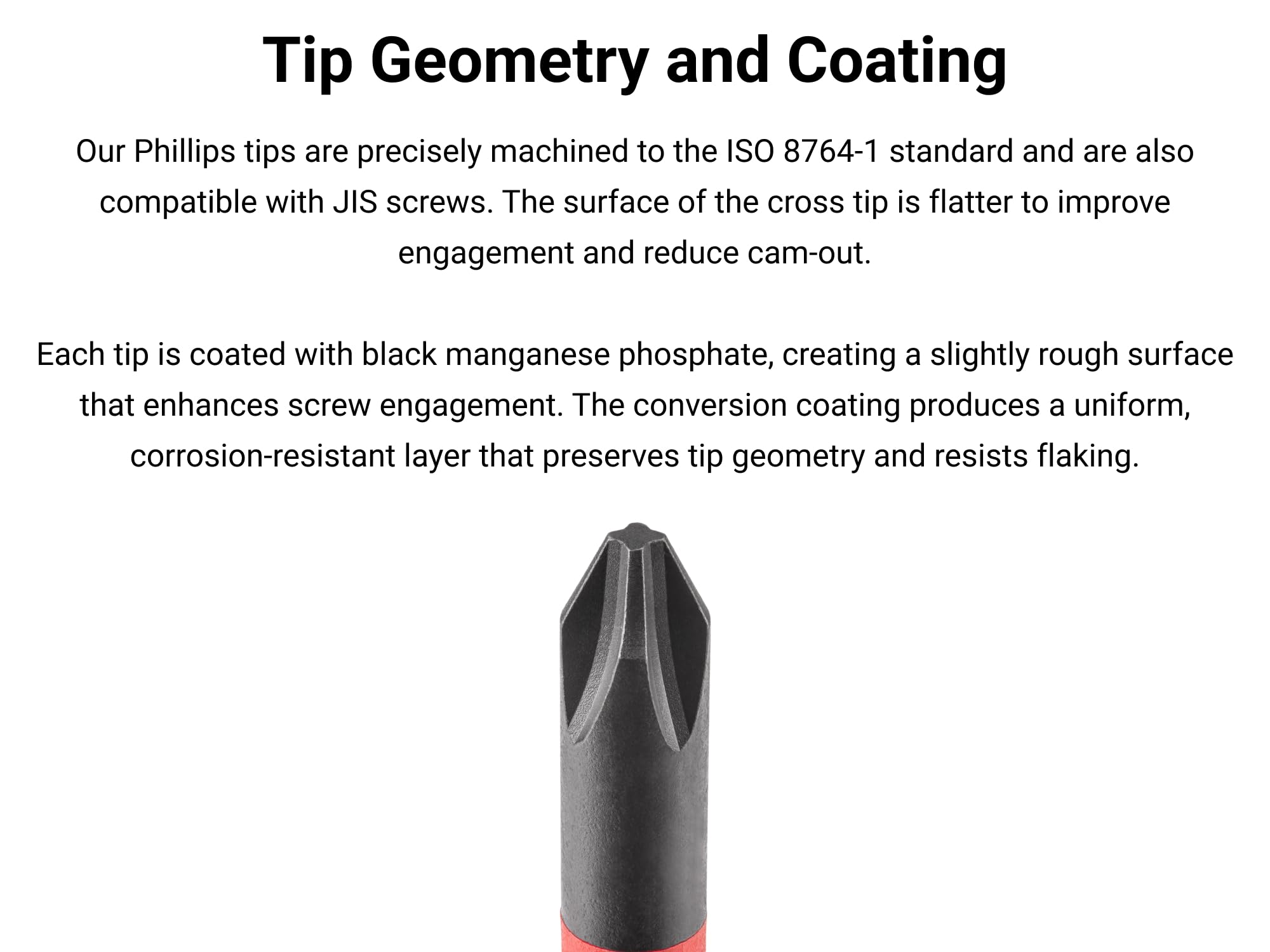 Phillips Tip – Our Phillips tips are made to the ISO 8764-1 standard and are also compatible with JIS screws; the surface of the cross tip is flatter to improve engagement and reduce cam-out