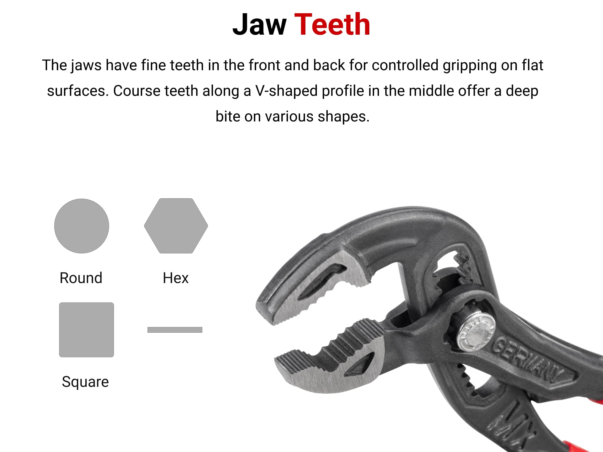 Jaw Teeth – The jaws have fine teeth in the front and back for controlled gripping on flat surfaces; coarse teeth along a V-shaped profile in the middle offer a deep bite on various shapes