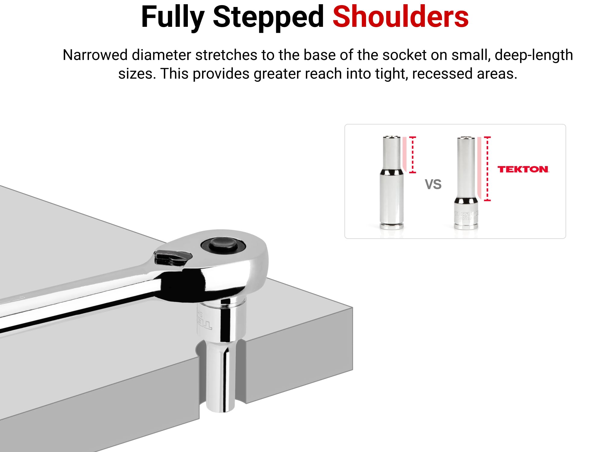 Secure Drive Tool Engagement – Detent grooves and beveled edges provide a smooth and secure connection with the drive tool